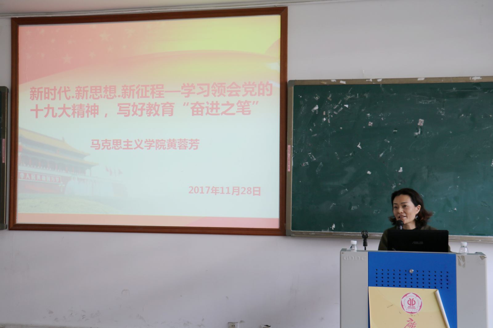 11月28日下午1:30,我院在工三208会议室举办学习十九大专题辅导报告会,邀请马克思主义学院黄蓉芳教授作题为《新时代·新思想·新征程——学习领会党的十九大精神,写好教育“奋进之笔”》的报告。会议由学院党委林军书记主持,全体教职工参加了会议。