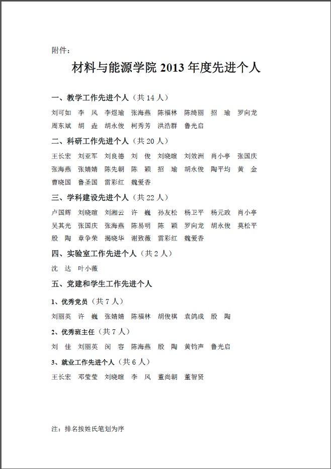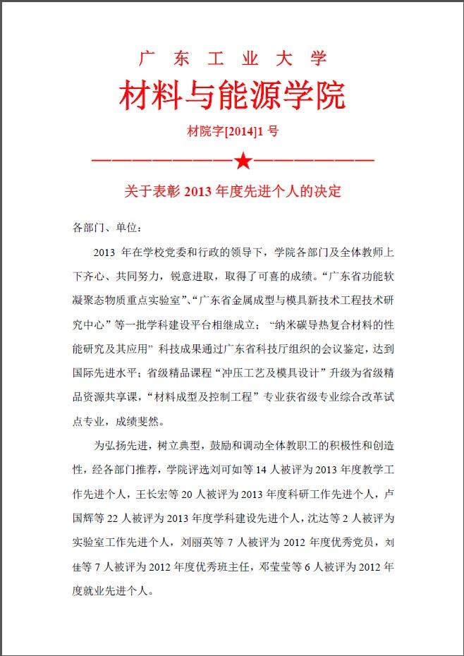 院字2014年1号 (关于表彰2013年度先进个人的决定)