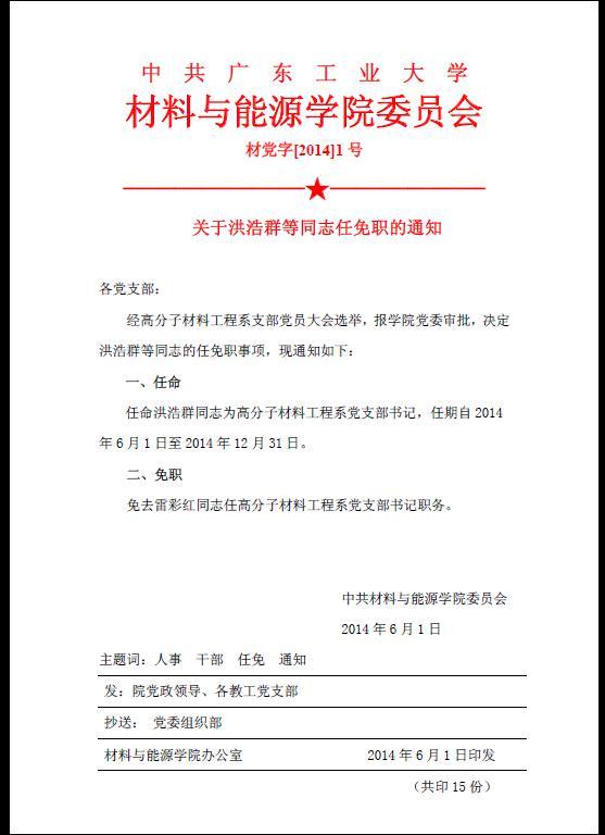党字2014年1号(关于洪浩群等同志任免职的通知)