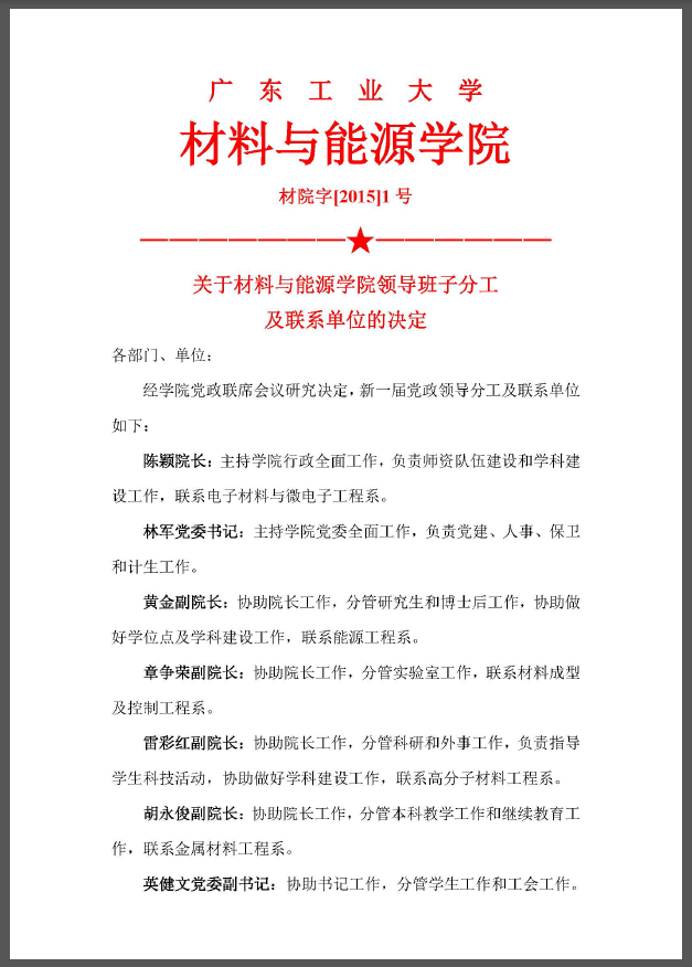 院字2015年1号(关于材料与能源学院领导班子分工及联系单位的决定)