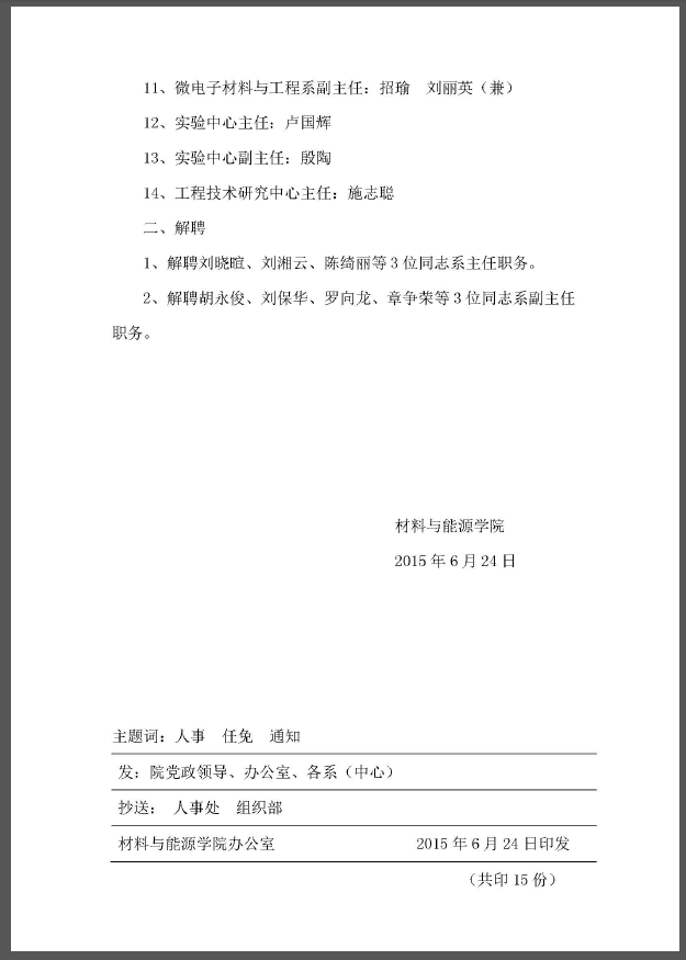 院字2015年1号(关于材料与能源学院领导班子分工及联系单位的决定)